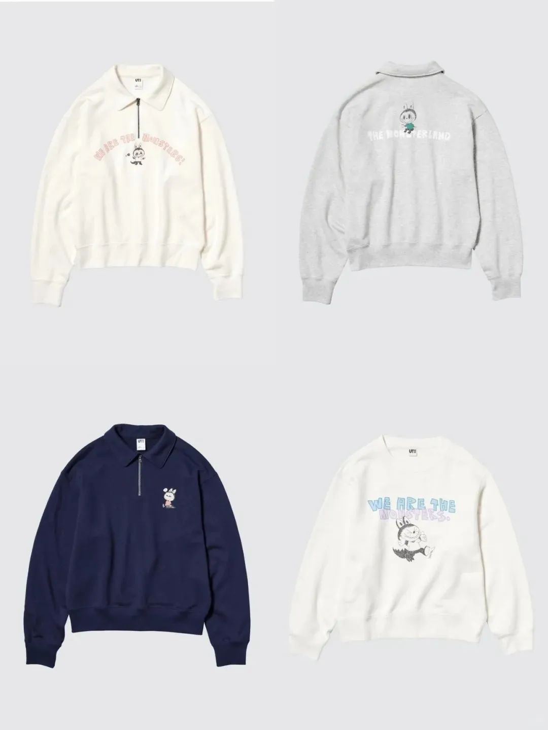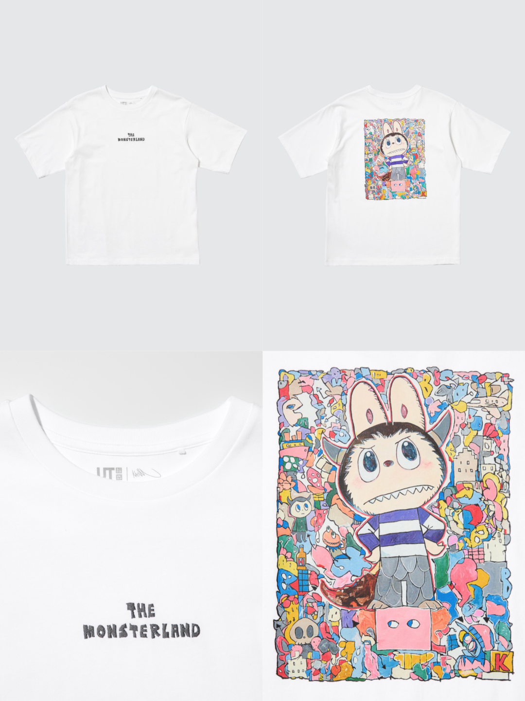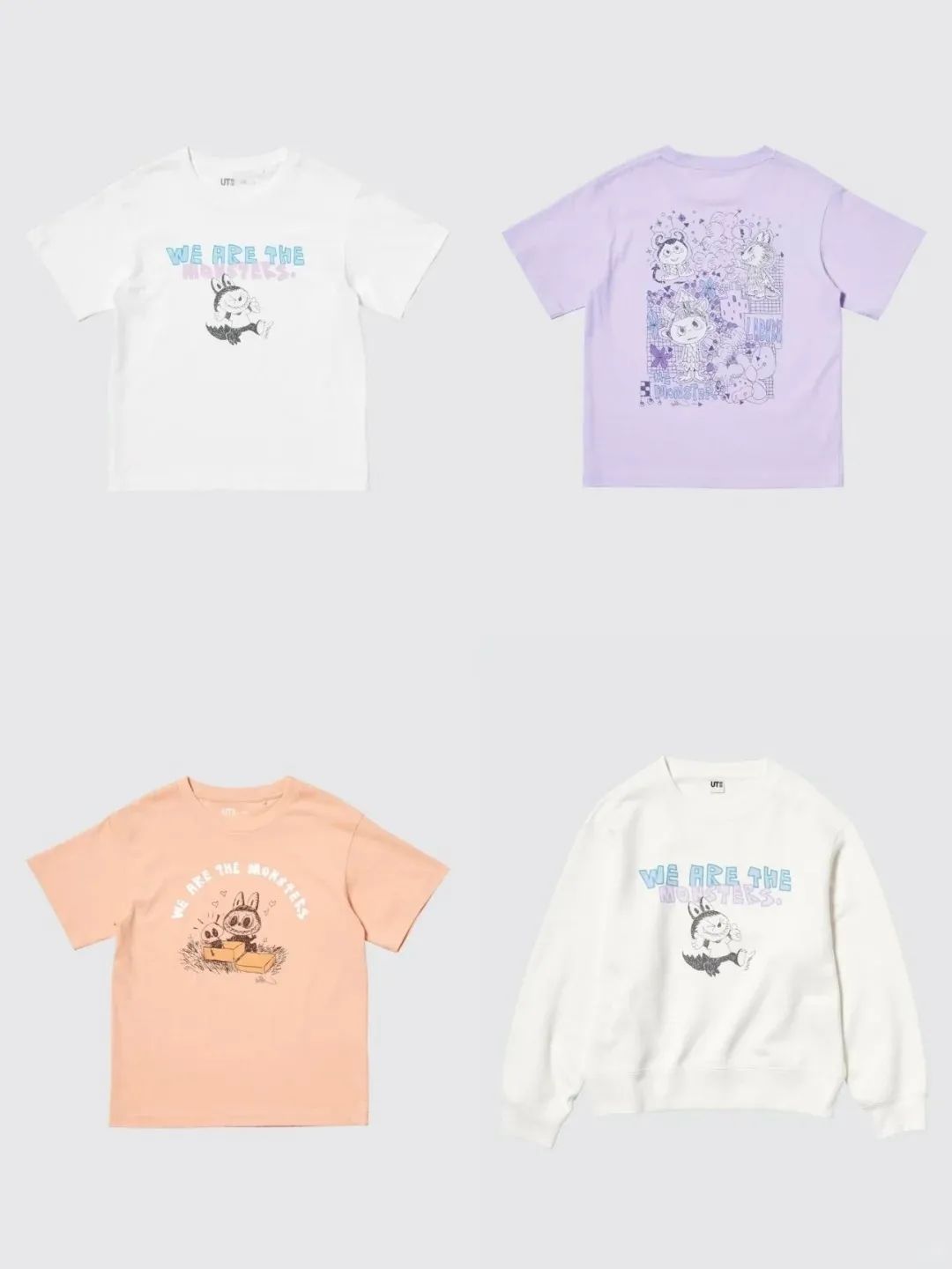 優衣庫 × 泡泡瑪特的合作系列產品設計,有4 款顏色分別為黑、白、灰、粉的印花短袖 T恤和衛衣。