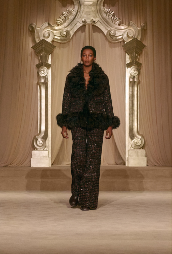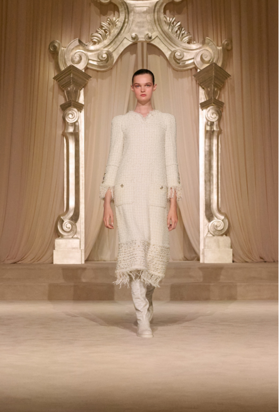 香奈兒大秀選址巴黎大皇宮,加拿大設計師Willo Perron將榮譽廳幻化為康朋街高定沙龍的復刻版——香檳色帷幔、純白地毯與軟墊長椅(品牌稱此為"對巴黎康朋街31號百年高定圣殿的想象")。但系列本身卻指向"廣袤自然",每位賓客座椅上的金麥穗暗喻嘉柏麗爾·香奈兒對蘇格蘭高地的摯愛。