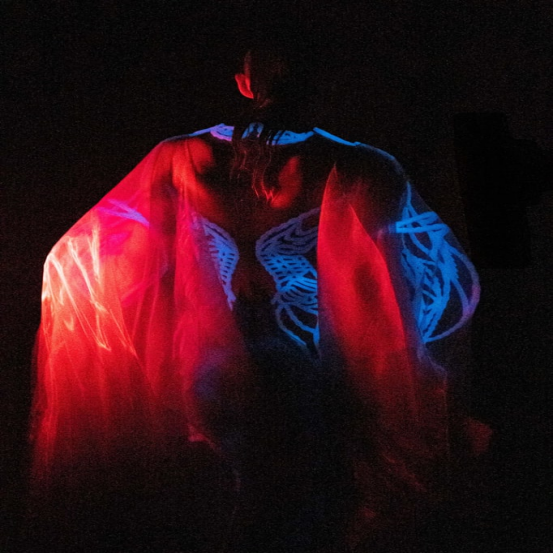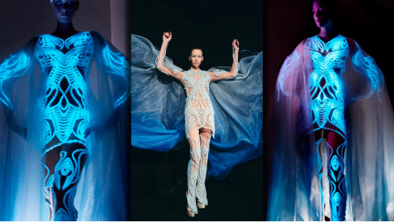 超模斯特拉·麥克斯韋(Stella Maxwell)在黑暗中完成了這場史無前例的換裝。為了維持"永夜"幻境,造型師們僅能借助微弱的紅光為她穿上開場禮服。當(dāng)衣料觸及肌膚的瞬間,整件禮服開始泛起幽藍(lán)光芒——這并非普通面料,而是由會(huì)"呼吸"的觸敏型發(fā)光生物織就的活體藝術(shù)品。