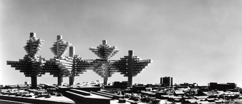 在城市規劃領域,磯崎新創造了他最有趣的未建成項目之一:東京“空中城市”計劃,通過增減模塊化空間實現城市的動態重組。他將城市理解為一個不斷輪回的存在,其“靈活、可移動、持續響應需求”的核心原則,成為磯崎新對未來城市的前瞻宣言。