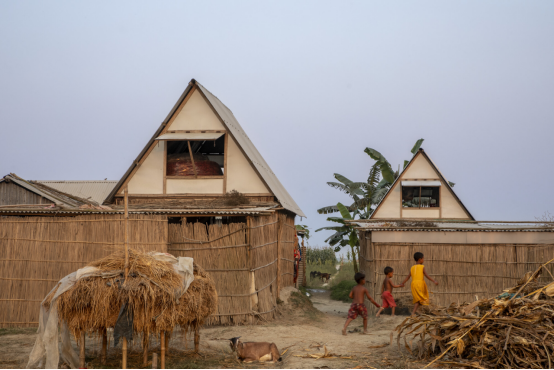 建筑師瑪麗娜·塔巴蘇姆(Marina Tabassum)及其在孟加拉國達卡的團隊于2018年開始研發Khudi Bari房屋模型。該項目在孟加拉語中意為“小房子”,旨在應對氣候變化導致的孟加拉國頻發洪災。該國位于孟加拉三角洲,處在三條大河的入海口,隨著喜馬拉雅冰川因地球溫度升高而融化,極易發生洪水。孟加拉國高達80%的土地是洪泛區。這種簡易結構采用人字形支撐的竹材,通過鋼連接件組裝而成,如果業主因水位上漲需要搬遷,可以輕松拆卸和重組。