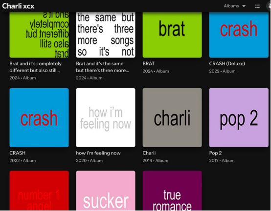 但仿佛無數(shù)種封面變體還不夠糟糕,最近還出現(xiàn)了一種更“褻瀆藝術(shù)”的風(fēng)潮:事后修改專輯封面。Charli XCX 的《Brat》可以說是近年來最具諷刺意味的標(biāo)志性封面之一。但這難道意味著她以前的所有專輯都需要用一模一樣的風(fēng)格重新設(shè)計(jì)嗎?在流媒體平臺上,她以往每張專輯的封面都被替換成了純背景加低分辨率文字標(biāo)題。這讓人不禁想起那句老掉牙的話:“還有什么是不容侵犯的嗎?”刪除舊封面剝奪了作品原有的語境與身份——同時也讓聽眾感到困惑。
