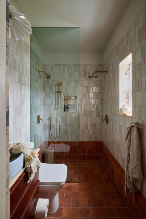 Rachel Gedymin Design 用豐富的陶土色地磚為這間紐約浴室奠定了基調(diào)。乳白色的 zellige 風格瓷磚包裹了部分墻壁,增強了大地色的外觀和感覺。