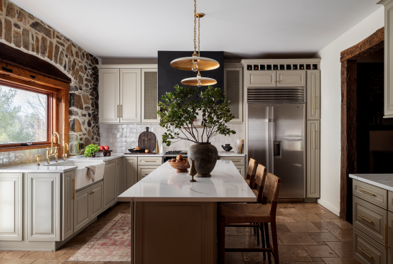 在這間費城廚房中,Old Soul Interior Design & Renovation Studio 結(jié)合了紋理瓷磚地板、石材特色墻、原木點綴、網(wǎng)面櫥柜門和編織凳,創(chuàng)造出一幅豐富的觸感材料掛毯。