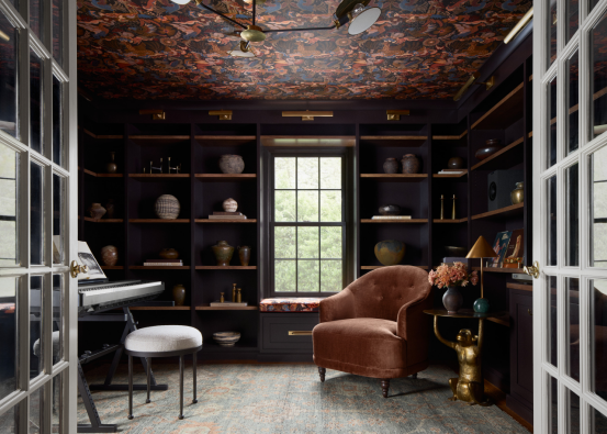 在這間由 Ernst Brothers 設(shè)計的賓夕法尼亞州哈弗福德的家庭辦公室中,天花板上的紋理墻紙與開放式書架后墻上的墻紙相呼應(yīng),使得粉藍色的建筑細節(jié)脫穎而出。
