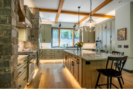 在這間由 Gold Hill Builders 設(shè)計的紐約廚房中,石英石外觀的臺面和相匹配的防濺墻創(chuàng)造了一件微妙卻醒目的展示品。