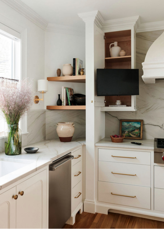 Kindred Interior Studios 的設(shè)計師 Emma Legg 和 Sydney Foley 在這間位于北卡羅來納州格林斯博羅的廚房中增加了一個液壓升降儲物系統(tǒng)。它可以在需要時降低開放式儲物架以取用油和其他烹飪必需品,然后用后整齊地收起來。