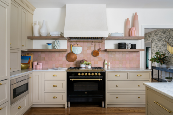 在華盛頓特區(qū),Spaces by Katie 增加了一個粉色 zellige 瓷磚防濺墻,賦予這間廚房一種趣味卻精致的外觀。