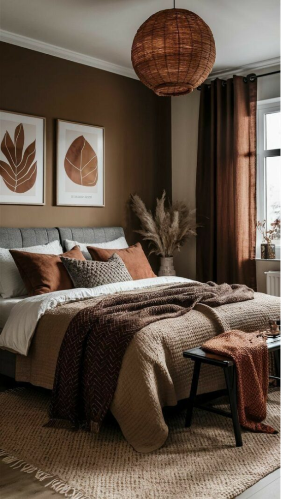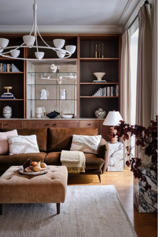 如果你想試水,配飾是嘗試棕色最簡單的方式。大地色調的抱枕、蠟燭、陶器或花瓶可以帶來恰到好處的溫暖感。一個巧克力棕色的燈罩或駝色陶瓷碗可能聽起來微不足道,但這些點綴 collectively 能產生顯著影響。因為它們投入成本低,你可以隨季節更換。棕色配飾也與季節性裝飾相得益彰,比如秋天的肉桂色蠟燭或春天的編織籃。隨著時間的推移,這些點綴會逐漸形成統一的外觀,而無需進行全面的設計大改造。