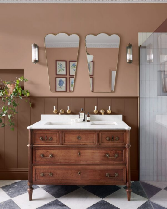 浴室通常被認為是明亮、白色的空間,但引入棕色可以使其更顯沉穩和溫馨。濃郁的摩卡色墻壁或深咖啡色調瓷磚能立刻帶來深度和精致感,而胡桃木或橡木制的木質盥洗臺則增添了溫暖。為保持清新感,可用淺色點綴來平衡深色元素,比如米色毛巾、奶油色臺面或柔和的環境照明。即使是棕色鏡框、青銅五金件或大地色調的配件等小細節,也能提升空間質感。最終打造出的浴室,能同時擁有水療般的寧靜、舒適和時尚,讓實用性與奢華舒適感并存。