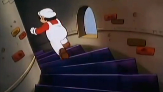 幸運的是,我們有視頻證據揭示了答案。這張令人困惑的靜態圖片取自1999年播出的動畫系列片《超級馬里奧兄弟超級秀》。鼓點聲……他正在上樓梯。跳到13:33自己看吧。