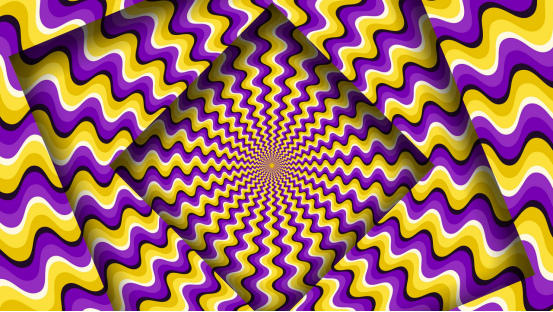 以其紫色和黃色漩渦狀的設計,這個錯覺很催眠,但我們保證它不是gif或視頻。它是一個完全靜止的圖像。當你讓眼睛在設計上徘徊時,不同圖案、光線和層次的組合會欺騙你的大腦,讓你認為它在移動。集中注意力在圖像的正中心,你應該能看到它停止。