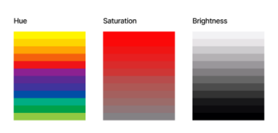 要理解色彩如何從心理上影響數字用戶行為,我們首先需要了解色彩是如何定義的。在數字設計中,色彩使用HSB 模型精確定義,該模型代表色相(Hue)、飽和度(Saturation)?和亮度(Brightness)。與 RGB(紅、綠、藍)等其他系統相比,該模型為設計師提供了一種更直觀的方式來思考和操作顏色。以下是每個組成部分的簡要說明: