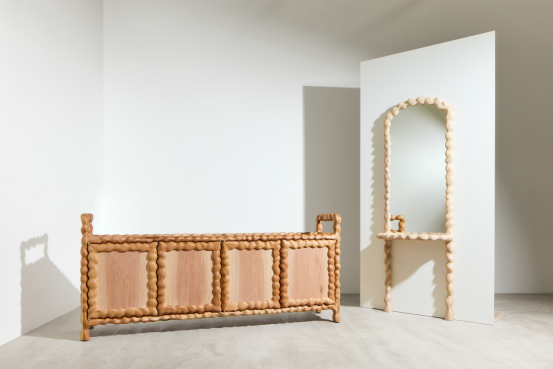 今年,許多嘗試木材創新的設計師來自年輕一代,他們渴望重新定義這種材料的可能性。其中包括出生于明尼阿波利斯、現居倫敦的設計師布萊克·卡爾森-喬舒亞(Blake Carlson-Joshua,BC Joshua工作室),他同樣在“我們賴以生活的物件”展覽中展出作品。他最近將實踐從紙漿擴展到了硬木,并將其與手工繪制的鋁材鑲嵌相結合。“使用木材讓我更容易將想法從紙上轉化為實物,”他談到這一發展時說,“使用CNC(數控機床)和激光切割等新系統塑造材料,為創意構思打開了新的大門。”