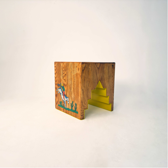 布萊克·卡爾森-喬舒亞(Blake Carlson-Joshua)的“Dogtrot II”凳由CNC切割的英國白蠟木和手工繪制的鋁材鑲嵌制成,其靈感源自美國南部的“dogtrot”住宅建筑和哈萊姆文藝復興的文化精神——這場發生在1910年代至1930年代的運動重新定義了美國的藝術表達和身份認同觀念。這件作品是他在紐約Colony設計駐留期間創作的,是一個更廣泛的“哈萊姆小屋”系列的一部分,旨在向卡爾森-喬舒亞的祖父致敬(他于1920年代移民到哈萊姆)。作品以黑人牛仔的彩繪圖案作為自由和自決的象征。該作品在艾瑪·路易斯·佩恩(Emma Louise Payne)策劃、位于Atelier Seventy-Six的“我們賴以生活的物件”展覽中展出,同時展出的還有他的“Topo Lamp”,一盞來自他正在進行的雕塑紙漿作品系列的吊燈。
