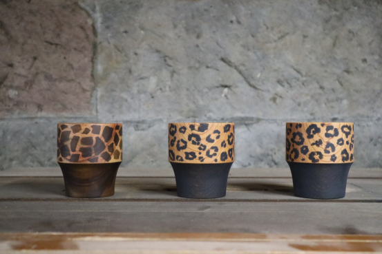 這些由奧修新太郎(Shintaro Oku)設計的可堆疊杯子在日本鹿兒島手工制作,采用日本樟木,并使用天然方法染色——醋用于產生長頸鹿般的圖案,柿單寧用于產生豹紋效果