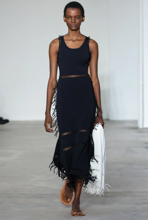 關鍵趨勢:?單色造型、薄紗與鉤編連衣裙主導。Calvin Klein 貫徹單色美學,Khaite 則以柔和剪裁搭配細膩薄紗。