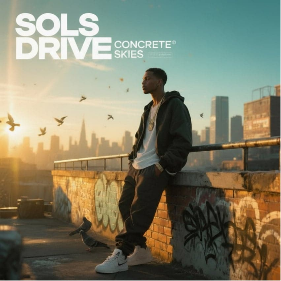'嘻哈;自信、陽光充沛、電影感酷炫(流派與情緒)+?金色時刻寫實城市屋頂;涂鴉覆蓋的護墻;鴿子騰飛;一個穿著街頭服飾的時尚身影倚靠在金屬欄桿上,處于情緒化的陰影中(主體/場景)+?寫實電影靜幀;基于物理的渲染;超細致;觸感材質(老化的磚塊、噴漆紋理、磨損的金屬、真實的皮膚和織物)(藝術風格/媒介)+?溫暖的金琥珀色和蜂蜜色高光,與石墨陰影平衡; subtle teal天空和藍色調(調色板)+?;低3/4角度,眼平線;三分法主體放置;城市天際線背景;淺景深(Depth of Field) 35–50mm效果;為文字留出充足的負空間天空(構圖/視角)+?變形鏡頭太陽耀斑;漂浮的塵埃微粒;輕柔的膠片顆粒;鴿子上的輕微運動模糊;勵志的城市敘事/主題(特殊效果/主題)+?文字:“SOLSTICE DRIVE”作為大標題位于左上角;“CONCRETE SKIES”對齊在旁邊較小; condensed techno-humanist grotesque字體,大寫,緊密字距 (+10–20),白色效果,清晰字間距,無陰影(文字元素)。'