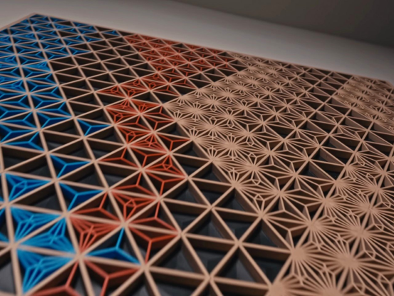 傳統(tǒng)的?Kumiko 嵌板通過精確榫卯與分層圖案制作而成,一直是觸覺上的奇跡。每一塊交錯拼接的木片不僅呈現(xiàn)圖案,更散發(fā)出豐富的紋理感。受此啟發(fā),一位加拿大創(chuàng)作者提出:如果 Kumiko 可以3D打印呢?這個問題引發(fā)了一場為期三個月的實驗,最終誕生出一款桌面大小的網(wǎng)格結(jié)構(gòu)——以鮮艷的塑料呈現(xiàn),卻仍富含傳統(tǒng)木制工藝的分層結(jié)構(gòu)與引人觸摸的幾何美感。超過1000個獨立插入件和196小時的打印時間,最終成品實現(xiàn)了非凡的效果:無縫的鳩尾榫與互鎖結(jié)構(gòu),外觀與手感皆如傳統(tǒng)榫卯,卻無需膠水或釘子。