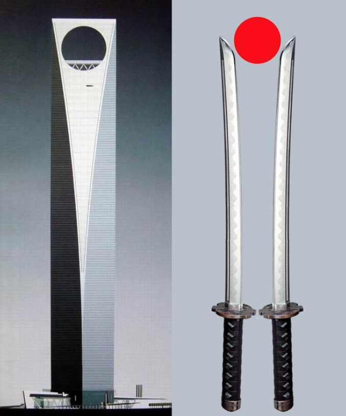 最開始的時候,這棟摩天大樓最初的設計方案并不是這樣的,大樓頂部原來的設計是一個空心圓形風洞。由于大廈的投資方來自日本,所以當時民間流傳,圓形象征著日本國旗上的太陽,兩條豎向棱邊被認為是日本軍刀。