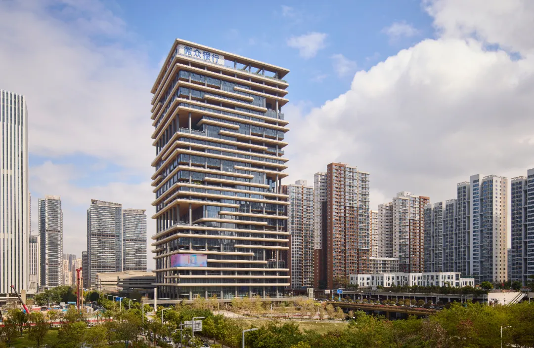 今年剛剛落成的微眾銀行新總部大樓,共30層,高148米,由SOM建筑事務所領銜設計,騰訊旗下的微眾銀行是中國第一家互聯網銀行,也是金融科技領域的領軍企業。