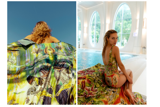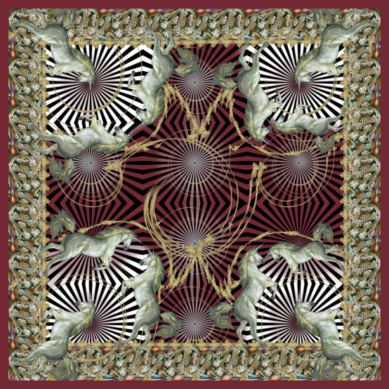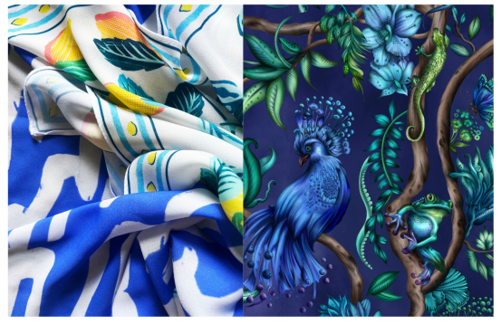 對(duì)于瑞士藝術(shù)家兼設(shè)計(jì)師?Ginny Litscher?而言,印花設(shè)計(jì)的創(chuàng)作過程仍然深深植根于物理技術(shù),以制作她復(fù)雜的圖案設(shè)計(jì),這些圖案被印在絲綢圍巾、泳衣、靠墊和其他服裝上。"我的藝術(shù)作品總是由我親手繪制或手繪完成的。而且我喜歡混合使用各種技法,"她說。"首先會(huì)有一個(gè)直觀的圖像自然地出現(xiàn)在我的腦海中。由于我有著如同相機(jī)般的記憶,顏色和細(xì)節(jié)已經(jīng)很清楚。然后我就開始工作。通常,我會(huì)在一張大畫布上開始繪畫——使用畫筆、鉛筆、墨水和油彩。對(duì)于更多細(xì)節(jié),我喜歡用墨水和油彩來讓顏色更突出。" 和許多同行一樣,Ginny 隨后會(huì)通過拍照或掃描到?Photoshop?中來將作品數(shù)字化,以便準(zhǔn)備用于生產(chǎn)的印花文件。