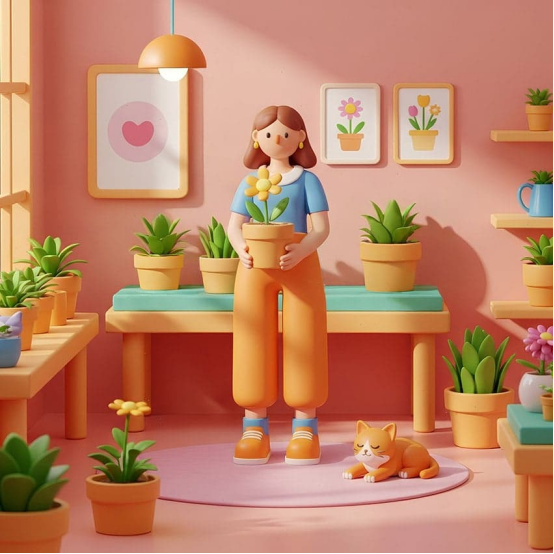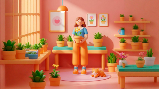 提示詞:"一個3D插圖,描繪了一位在植物苗圃中的女子,手捧花盆,一只可愛的小貓躺在地板上,采用可愛的圓潤極簡塑料質感風格(受Blender啟發),構圖包含帶有極簡印花圖案的墻壁,陽光透過窗戶照射進來,形成充滿活力的自然光照和柔和的全局照明,使用色彩繽紛、充滿活力的調色板,帶有趣味細節,渲染為超精致、高質量的圖像。"