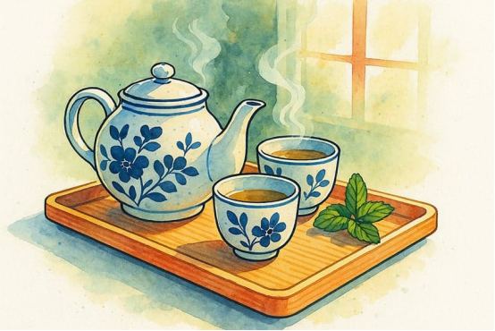 "一套陶瓷茶具,包含茶壺、兩個杯子和一小枝薄荷(主體)+ 水彩畫風格,邊緣柔和(風格)+ 四分之三角度放置在竹盤上,采用三分法則構圖(構圖)+ 漫射的清晨窗光,帶有柔和的陰影(燈光 / 渲染)+ 青花瓷紋飾,半透明質感,升騰的蒸汽,輕微的水彩暈染和潑濺效果,色調為啞光鼠尾草綠、深靛藍、暖赭石和米白色,可見細微的冷壓紙紋理(細節 / 調色板)+ 背景干凈,高分辨率,印刷就緒(質量)。"