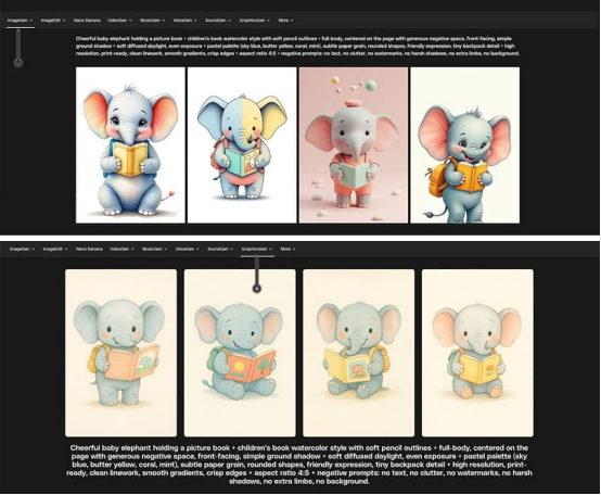選擇與你特定目標一致的AI圖像模型。對于照片級真實感圖像、產品拍攝、風格化角色、動漫或超現實主義藝術,最好使用 ImageGen。另一方面,GraphicsGen 更適合風格化插圖,例如波普藝術、Eko素描、雜志插圖和柔和的兒童書籍藝術等。如果你不確定使用哪個模型,可以嘗試用相同的提示詞測試兩者并進行比較。