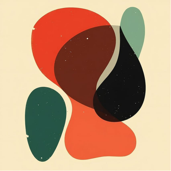 提示詞:"一個抽象形狀的Risograph印刷品;風格:極簡矢量藝術,帶有粗線條;干凈的居中布局,大量留白和平衡的邊距;真實的Risograph外觀,帶有平涂專色、半色調顆粒、輕微的套印錯位和細微的紙張紋理;有限的Riso紅色、綠色和黑色調色板,形狀邊緣有清晰的白色輪廓,簡單的幾何形態;高分辨率,海報就緒,清晰干凈。"