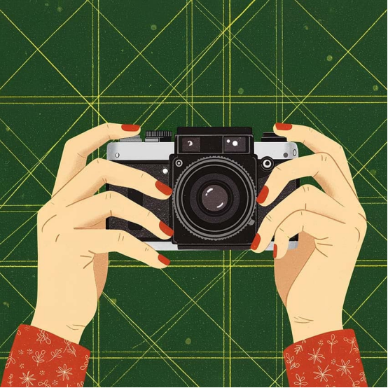 提示詞:"一張老式膠片相機被雙手握著的海報插圖;采用扁平的、經典的20世紀雜志封面風格,帶有復古圖案;構圖為中心對稱的肖像,相機被雙手緊密框住,海報邊距寬大;采用均勻的印刷般光線渲染,干凈的矢量邊緣,細微的半色調陰影和紙張紋理;背景為綠色格子布料,帶有黃色線跡,使用啞光復古配色,包括森林綠、芥末黃、奶油色和木炭色;超清晰,印刷就緒,高分辨率。"