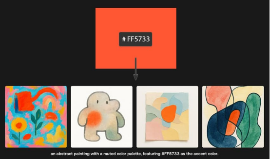 在專業工作中,獲得正確的顏色非常重要,尤其是當你需要遵守品牌指南時。你可以在提示詞中提到特定的顏色,但要記住結果可能會有所不同。在風格描述中使用描述性的顏色名稱,如"天藍色"或"森林綠"。為了更精確,使用十六進制代碼或其他顏色值會很有幫助。例如,你可以說:"一幅啞光色調的抽象畫,以 #FF5733 作為點綴色。"雖然AI可能不總是能精確命中顏色,但包含十六進制代碼提供了更清晰的方向,并增加了更接近匹配的可能性。這有助于減少猜測,并為你提供與品牌形象完美契合的、即用型資源。