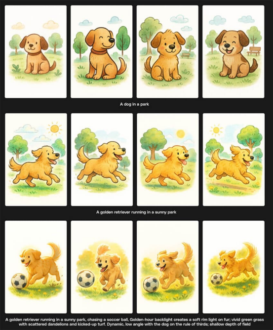 提示詞具有層次結構。把最關鍵的元素放在前面。將重要的放在首位:主體和風格。接著是構圖和光線,然后從最重要到最不重要地撒入細節。避免相互沖突的指令,如"極簡主義和高度細節化",除非這種對比是有意的。因此,要明確哪個占主導地位。例如,"極簡主義,帶有一個裝飾性焦點"。清晰比巧妙更重要;一個直接、結構良好的提示詞比一個復雜、詩意的提示詞更有效。