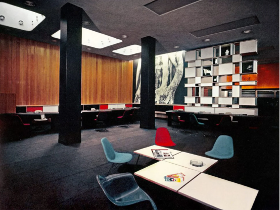 法國航空公司是佩里安的一個重要客戶——這一合作關系因她的丈夫雅克·馬丁在該公司工作而得到加強——她在1957年至1963年間改造了其在巴黎、倫敦和東京的辦公室,將實際的商業需求與現代性及舒適性的愿景融合在一起。「云朵」書架成為了標志性的空間隔斷,而配件和家具的模塊化方法則實現了靈活的配置。