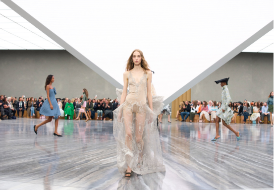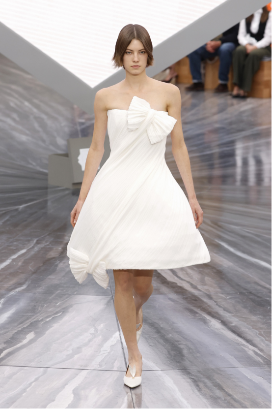 在盧浮宮、法國安妮王后的奢華夏日公寓舉行的尼古拉·蓋斯奇埃爾為路易威登帶來的最新系列,試圖捕捉"私人領(lǐng)域的無限自由"。通過對睡衣和內(nèi)衣的喚起——以及串珠花卉刺繡、緞面褶邊和巨大蝴蝶結(jié)的點(diǎn)綴——這個穿越時代的系列捕捉到了貫穿本季的浪漫情調(diào),它受歷史影響,但在結(jié)構(gòu)上卻 distinctly 現(xiàn)代,且絕不甜膩。