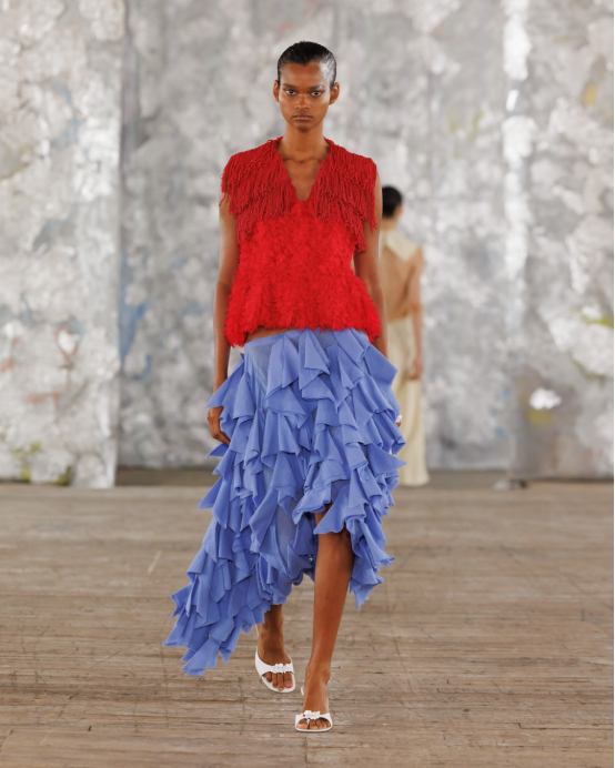 伴隨著對自由的探索,色彩的運(yùn)用也同樣奔放,設(shè)計(jì)師們擁抱大膽、自信的色調(diào),使之成為一段時間以來最多彩的時裝季——這或許是對其他地方陰郁氛圍的一種回應(yīng)。這一趨勢并不局限于單一城市:在紐約,雷切爾·斯科特其個人品牌Diotima的首場時裝秀給人留下了深刻印象,靈感源自狂歡節(jié)的活力精神——生動、如畫般的調(diào)色板涵蓋了亮紅、天藍(lán)和櫻桃紅,呈現(xiàn)于銀蓮花般的褶邊和流蘇裝飾上——而在倫敦,則有來自Erdem、Talia Byre和博柏利的色彩飽和造型(一件熱粉色的繞縫皮革夾克作為后者的閉幕造型,創(chuàng)意總監(jiān)丹尼爾·李借鑒了1960和70年代音樂家的著裝規(guī)范)。