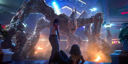 這是該劇更傾向于科幻恐怖的地方。外觀完全改變?!豆制嫖镎Z》的美學(xué)變得更黑暗、更混亂(更少的霓虹燈,更多的腐朽)。如果霍金斯是正常世界,這就是隱藏在下面的東西。