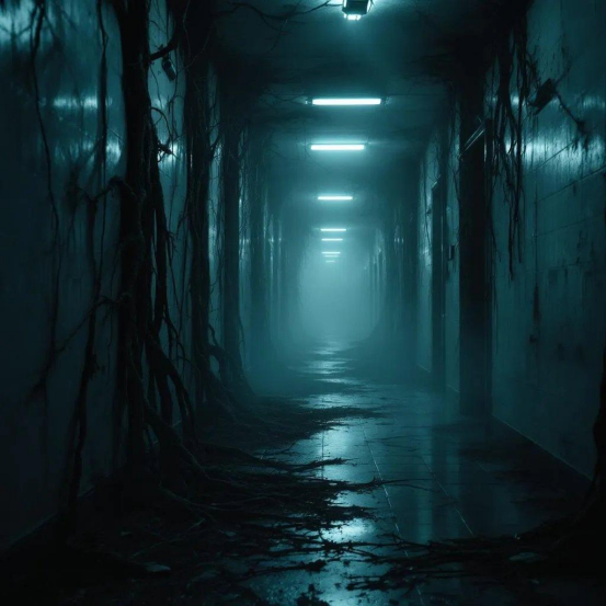 "廢棄的學(xué)校走廊,根須穿過墻壁生長,閃爍的燈光,濃霧,詭異的氣氛,80年代恐怖風(fēng)格,柔和的色彩"