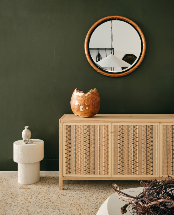 這款蘇門答臘拉菲草紙結合了不規則的編織與結節和粒結,創造出溫暖、有觸感的飾面。
