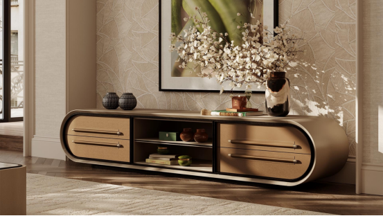 這款由葡萄牙波爾圖公司Frato制作的電視柜,采用木飾面、皮革和黃銅材質,抽屜內襯為麂皮,將簡潔的線條與柔和優雅的外觀相結合。