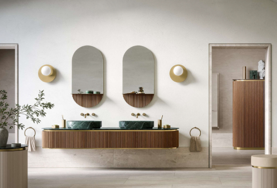 同樣地,Oasis展示了一系列曲線型浴室家具和配件,這款優雅的Nàos梳妝臺是核心展品。該單元由凹槽胡桃木和黃銅制成,配有Verdi Alpi大理石臺面和水槽,前面有兩個抽屜,兩側各有一個弧形門櫥柜。