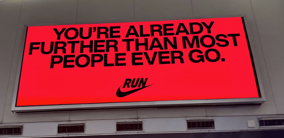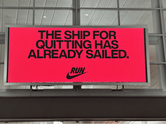 沒有明星運動員。沒有產品特寫。沒有技術參數。只有用Helvetica字體呈現的大膽宣言,加上耐克勾形標志和"RUN"標識。這種簡潔性使得廣告無論在30英尺外還是3英尺前都同樣有效。它們易于拍攝、易于記憶、易于傳播。