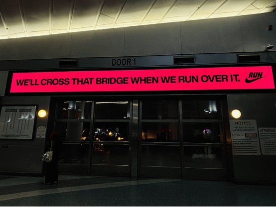 正確的周次 + 正確的地點 = 文案感覺像是為你而寫。交通廣告之所以有效,是因為71%的乘客會"頻繁"或"幾乎總是"觀看廣告。他們是在此停留5-10分鐘的"受俘"受眾。耐克清楚地知道懷疑何時會悄然出現,并直接面對它。