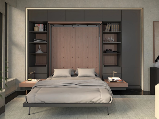 其機械結構代表了隱藏在簡單操作背后的精密工程。隱藏的活塞和不可見的硬件將機械部件置于視線之外。床面在打開時充當浮動支撐基座,一體的焊接鋼制床架和板條系統可支撐任何厚度達11英寸的大號床墊。折疊時的懸浮支腿設計和簡潔側面輪廓,營造出一種開放、自由的美感,而非傳統墨菲床的封閉柜體外觀。