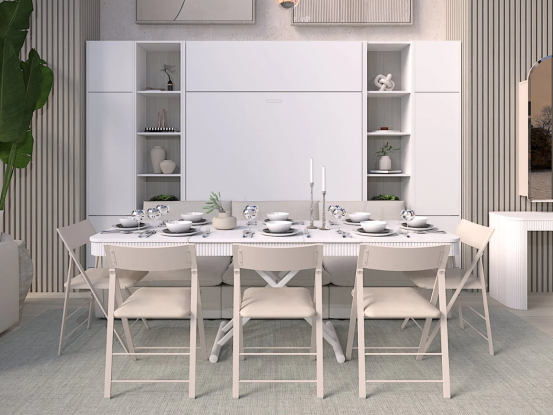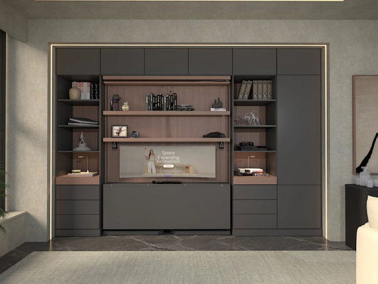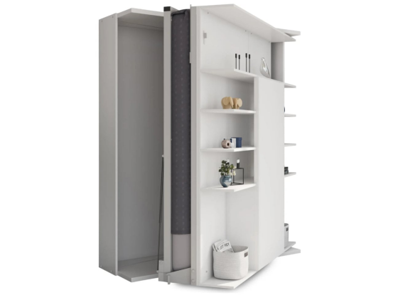 Compatto 代表了 Expand 產品線中機械結構最雄心勃勃的一款。這套意大利制造的系統將一張大號墨菲床與一個集成的寬大書桌相結合,書桌支持雙顯示器或完整的家庭辦公室設置,外加用于放置顯示器、書籍和辦公用品的額外擱架。該單元可旋轉180度以展現床體,而在整個變形過程中,書籍和裝飾品仍能平衡地放在擱架上。所有機械結構均設計為可單人順暢操作。