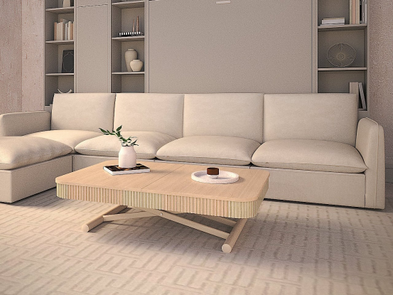 Box Coffee Curve 茶幾在展示機械巧思的同時,也彰顯了藝術性。它由優質硬木橡木制成,曲線凹槽設計的特點在于其手工切割、成型和拋光的細節,均由技藝精湛的工匠完成。這種水平的工藝將這件產品從純功能性的變形家具提升為散發精致感的標志性設計。