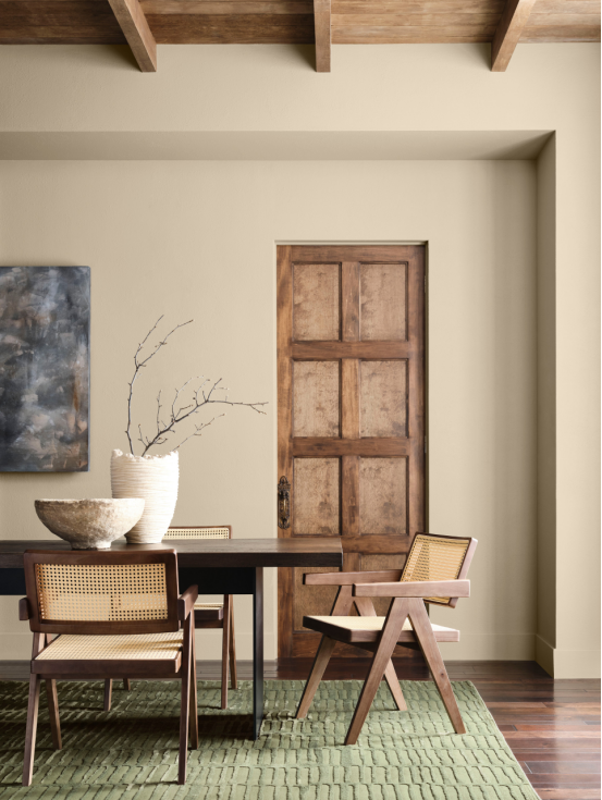這種來自 Sherwin-Williams 的柔和棕褐色因其永恒的簡約感而被選中。它的深度從淺到中等,帶有溫和的黃色和棕色底色,營造出隨意的溫暖感。