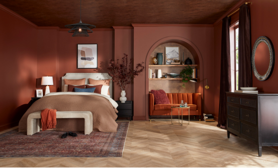 Warm Mahogany 是一種奢華的紅橙色,被大地棕色的底色所柔化,非常適合用舒適的色彩包裹整個房間。它是臥室等私密空間的理想選擇,也適用于餐廳或廚房等更公共的區域。
