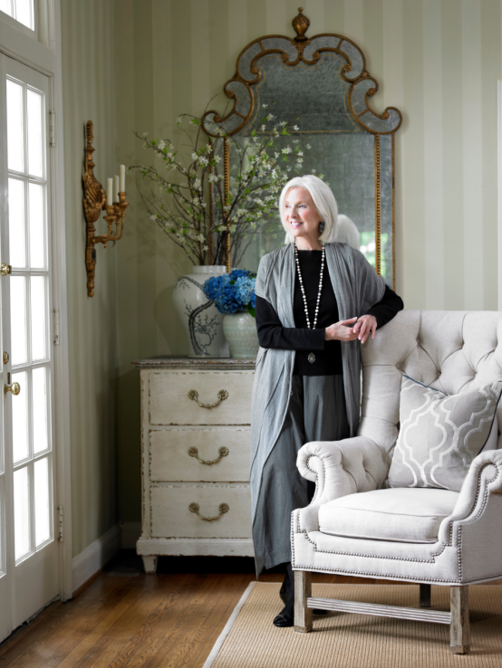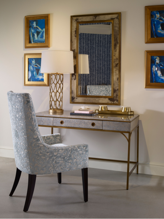 另一個值得關注的、聚焦傳統設計的市場新品是Sherrill Furniture旗下Lillian August品牌的Antiquaire系列,其靈感源自18和19世紀的法國與瑞典家具。圖中,設計師August正站在該系列的Iris Serpentine儲物柜前,這款柜子擁有逼真仿古漆面效果。