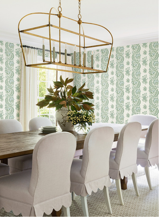 例如,York Wallcoverings的Beaumont花卉條紋墻紙(如圖)的靈感源自采用傳統手工雕版印刷技術制作的老式印花。(同時請注意帶裙邊的餐椅——這是展會上看到的另一個傳統細節。)墻紙和面料中其他流行的植物圖案還包括白菜玫瑰、牡丹以及受新藝術運動影響的銀杏葉,它們與我們在過去幾季中見過的中式風印花一同出現。